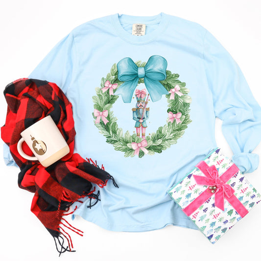 Nutcracker Wreath Coquette - Women's Garment Dyed Long Sleeve Graphic T-Shirt