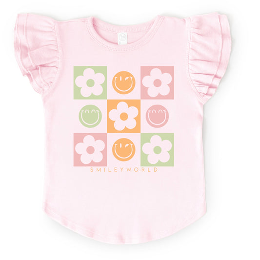 SmileyWorld Checkered Floral Smile - Flutter Sleeve Graphic T-Shirt