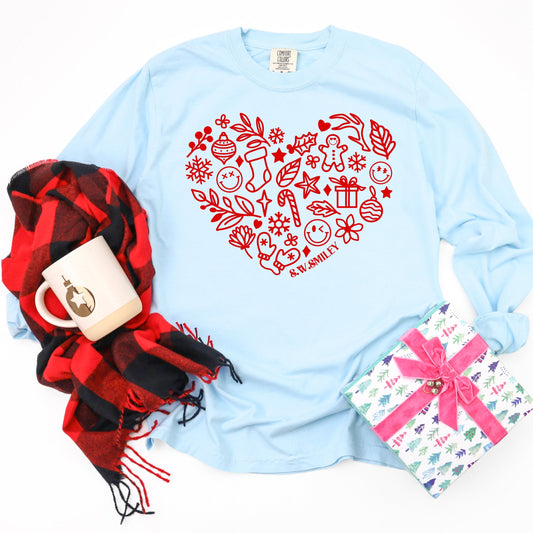 S.W.Smiley Christmas Outline Heart - Women's Garment Dyed Long Sleeve Graphic T-Shirt