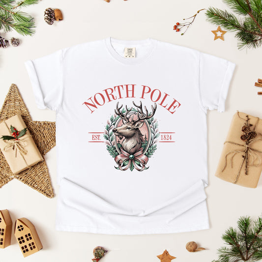 North Pole Reindeer Oval Wreath | Garment Dyed Tee