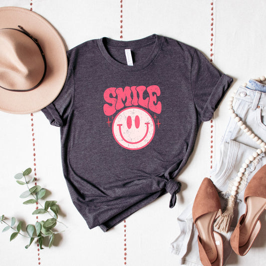 Pink Smiley Distressed | Short Sleeve Crew Neck