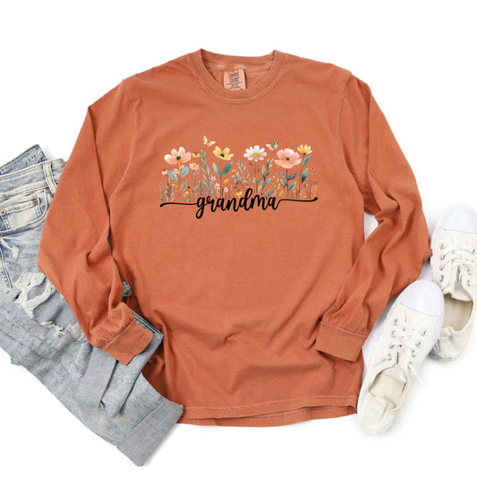 Grandma Watercolor Flowers - Women's Garment Dyed Long Sleeve Graphic T-Shirt