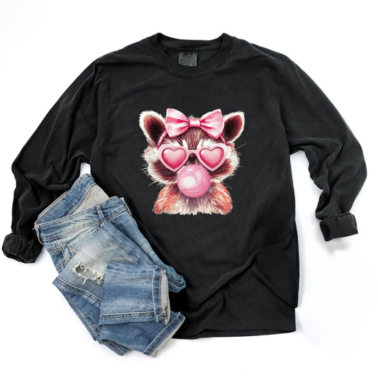 Valentine Raccoon With Bubblegum - Women's Garment Dyed Long Sleeve Graphic T-Shirt