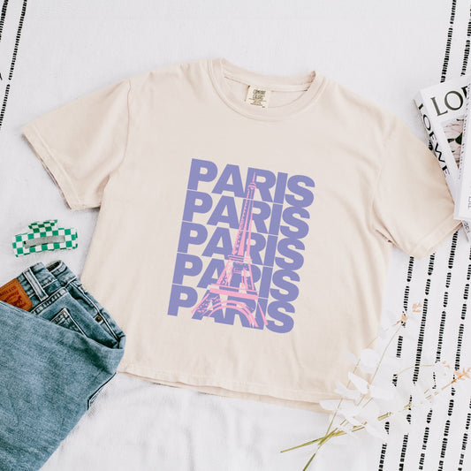 Paris Stacked Purple - Women's Boxy Crop Top Graphic T-Shirt