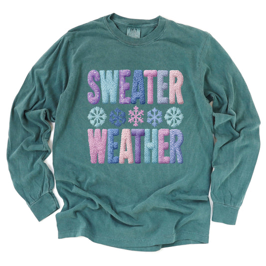 Sweater Weather Snowflake Knit Print - Women's Garment Dyed Long Sleeve Graphic T-Shirt