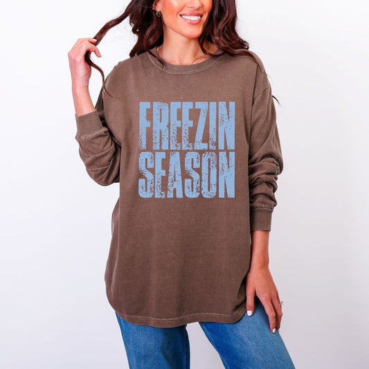Freezin Season Block Distressed - Women's Garment Dyed Long Sleeve Graphic T-Shirt