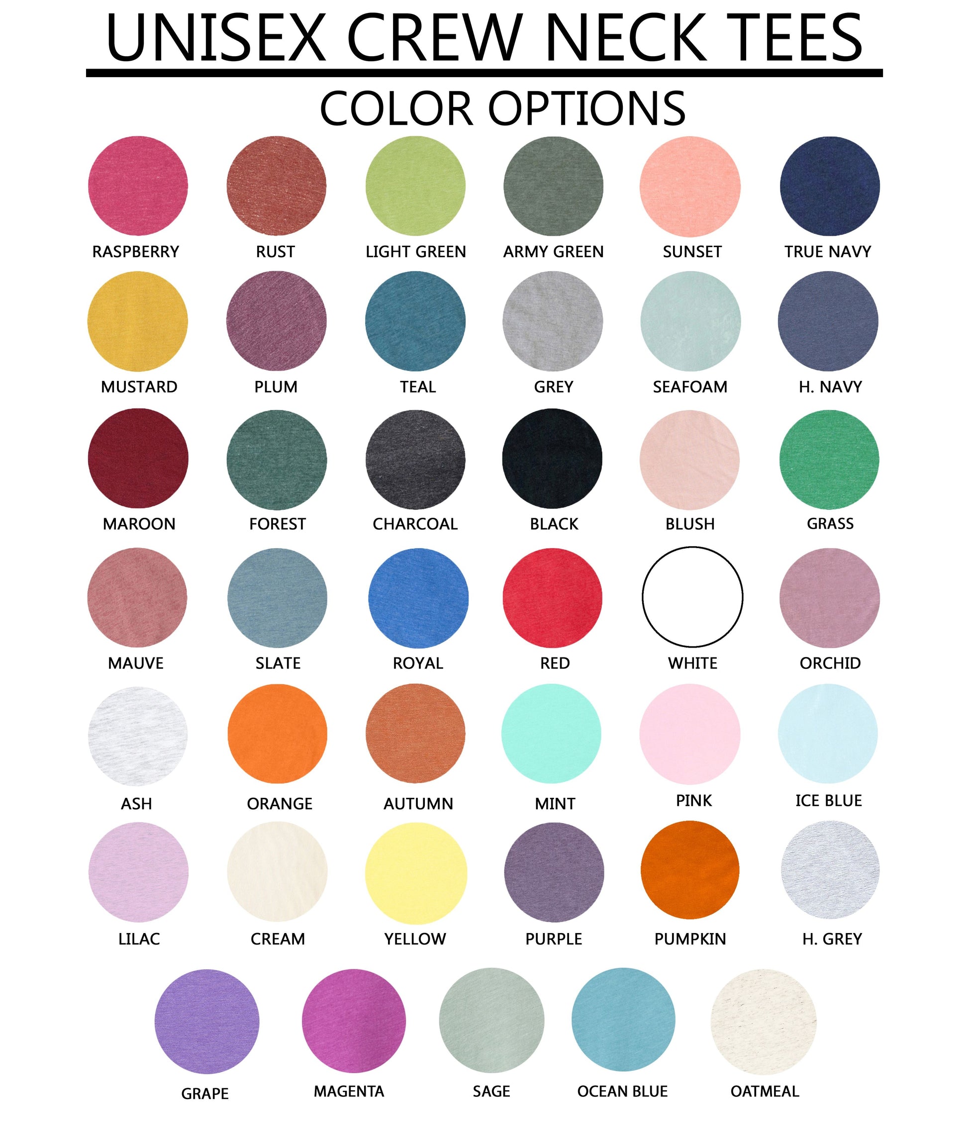Army Green, Autumn, Black, Blush, Charcoal, Cream, Forest, Grape, Grass, Grey, H. Grey, H. Navy, Ice Blue, Light Green, Lilac, Magenta, Maroon, Mauve, Mint, Mustard, Oatmeal, Ocean Blue, Orange, Orchid, Pink, Plum, Pumpkin, Purple, Raspberry, Red, Royal, Rust, Sage, Seafoam, Slate, Sunset, Teal, True Navy, White, Yellow